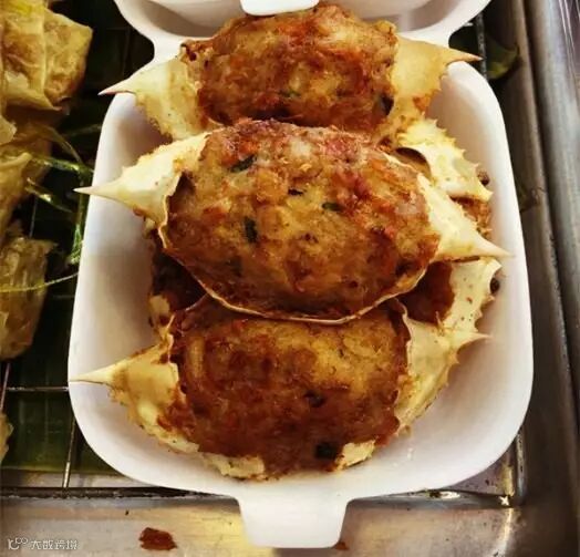 金灿灿的蟹壳里面,包含了丰富的馅料,虾肉、蟹肉、豆腐、猪肉、鸡蛋等等。浓郁的咖喱香味配上蟹肉的鲜美,回味无穷。