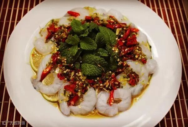 鲜虾,配以柠檬、鱼露、蒜、辣椒、少量薄荷叶调味,酸辣Q弹。泰国本地人喜欢配上新鲜的苦瓜一起食用,享受美味的同时又可以清热去火。