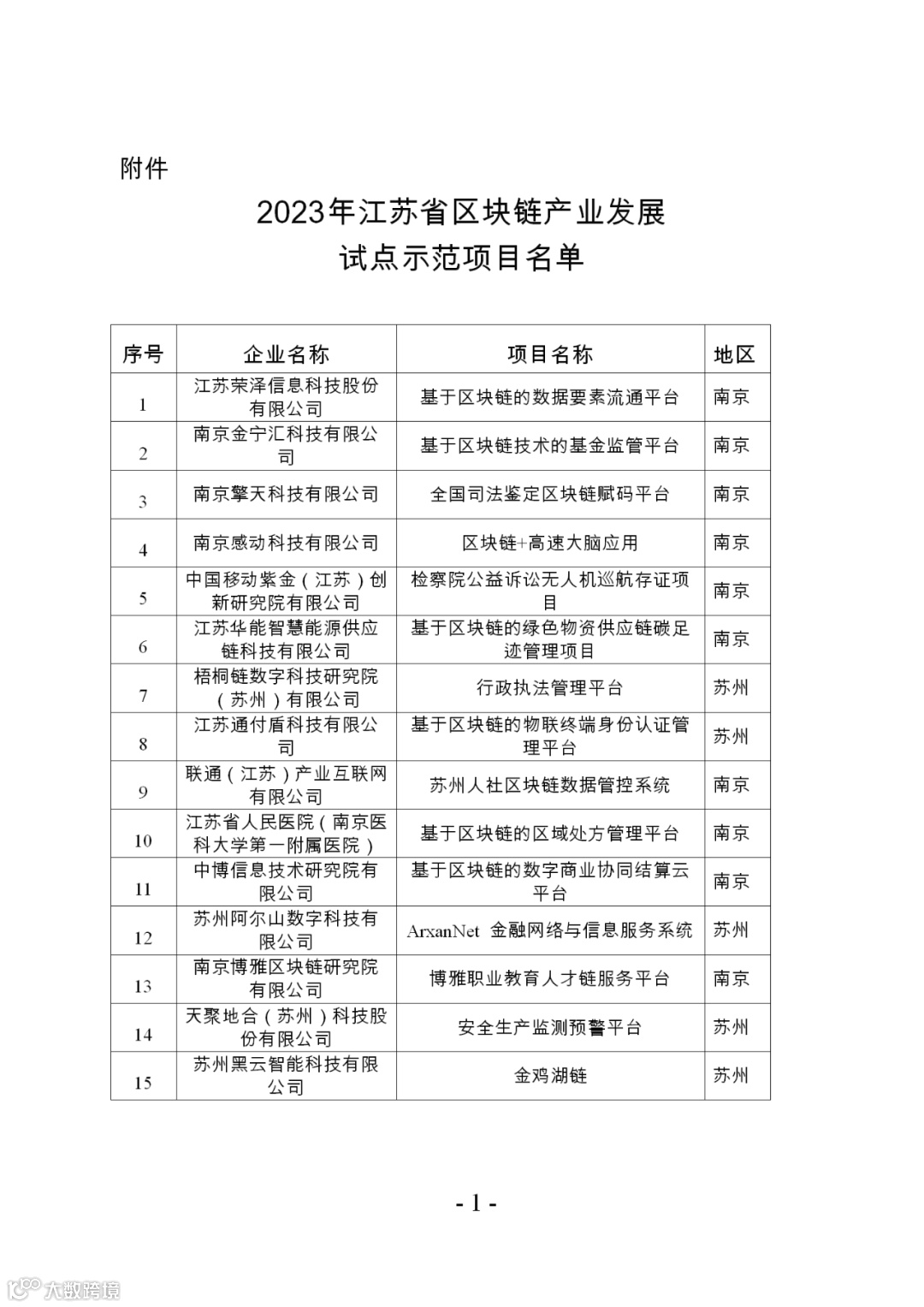 省工业和信息化厅关于公布2023年江苏省区块链产业发展试点示范项目的通知
