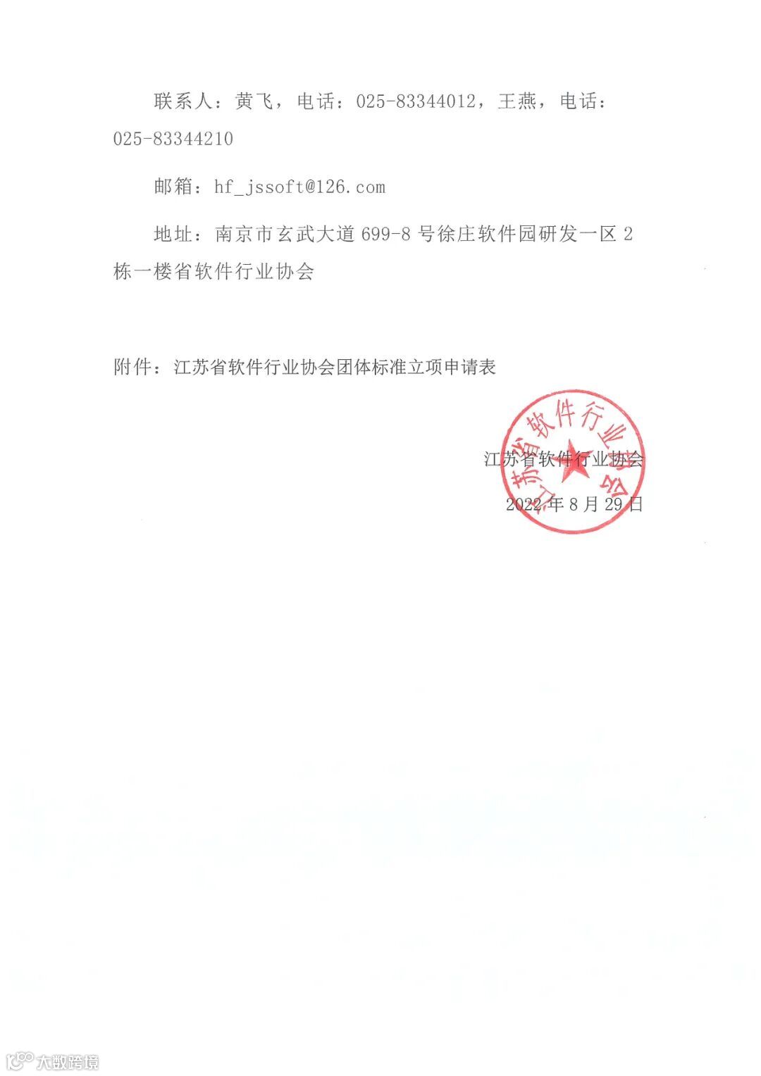 为贯彻落实国家软件发展战略,积极响应《新时期促进集成电路和软件产业高质量发展的若干条政策》、《"十四五"软件和信息技术服务业发展规划》等相关政策部署,依据国务院《深化标准化工作改革方案》行动计划(国办发〔2015〕67号),国家质检总局国家标准化管理委员会《关于培育和发展团体标准的指导意见》(国质检标联〔2016〕109号),国家标准化管理委员会民政部《团体标准管理规定》(国标委〔2019〕1号)等文件精神,根据《江苏省软件行业协会团体标准制定程序》,现面向社会征集软件行业相关团体标准。具体事项如下: