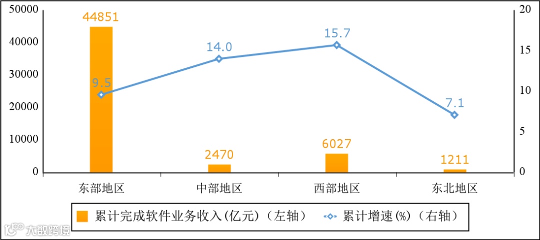 东部地区软件业务收入增速有所回落,西部地区增势领先。