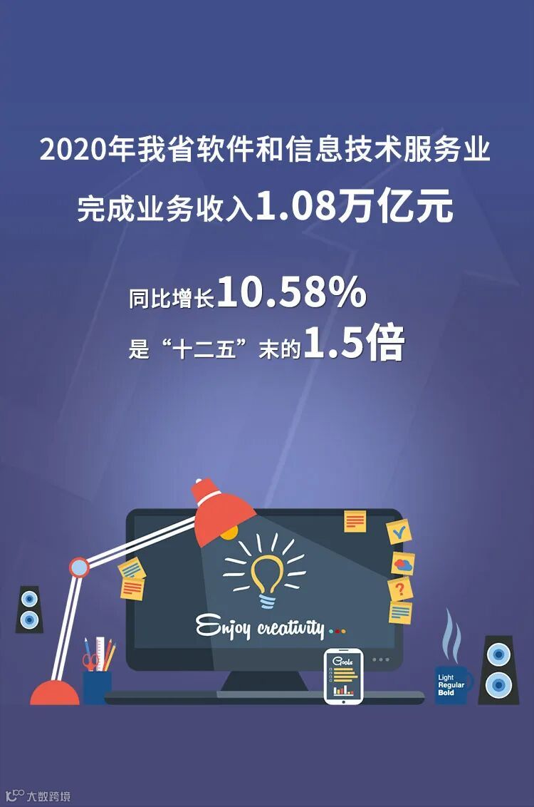 导读:2020年我省努力克服疫情影响,软件和信息服务业收入首次实现破万亿元目标,完成业务收入1.08万亿元,同比增长10.58%,是“十二五”末的1.5倍,成为数字经济发展的强大引擎。