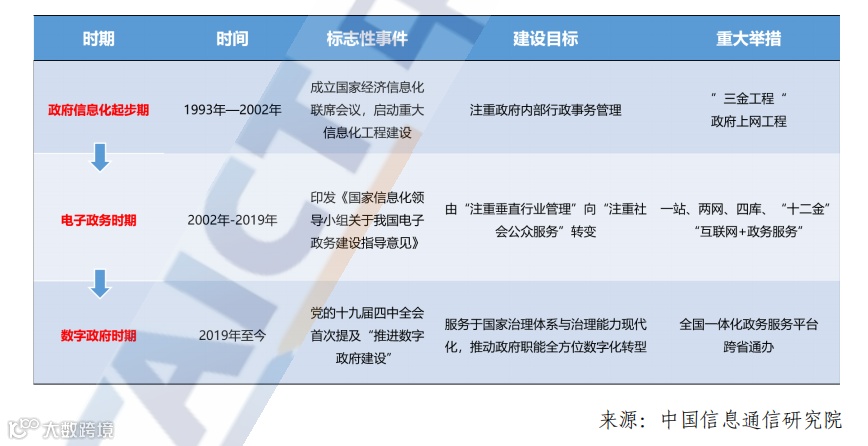 从国家层面出台的重大政策、重大举措来看,可以将我国政府信息化大致划分为三个时期:政府信息化起步期(1993年-2002年)、电子政务时期(2002年-2019年)和数字政府时期(2019年至今)。