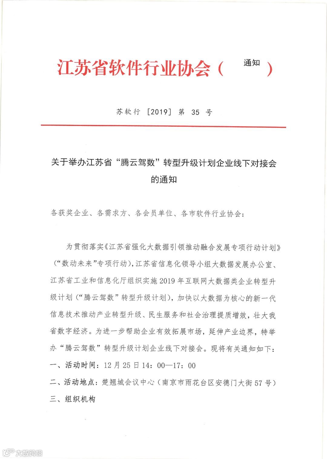 导读:关于举办江苏省“腾云驾数”转型升级线下对接会的通知