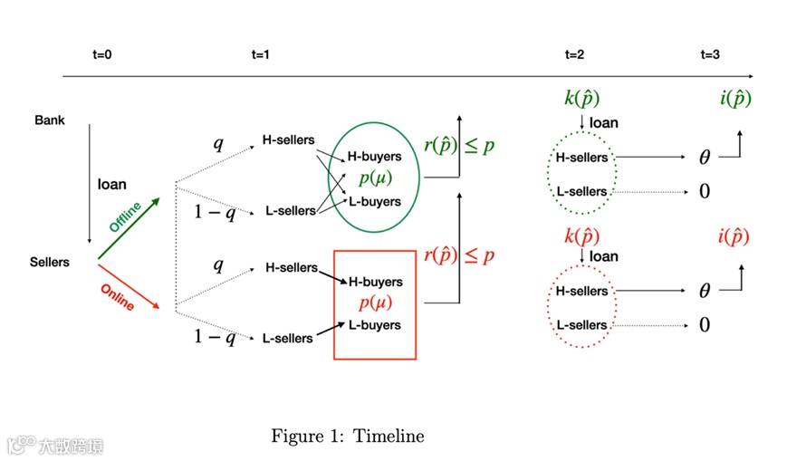 银行在t=0和t=2时被赋予一单位的投资品。他们的机会成本是一个单位投资成本,可以在t=0和t=2时将投资品借给卖家。银行既不能承诺长期合同,也不能承诺不重新谈判贷款条件。因此,就像他们可以在t=1和t=3时设定条款。在设定这些条款时,银行家会提出“要么接受,要么放弃”的报价。然而,卖家可以带着他们销售额的一小部分λ离开。如果他们使用银行存款作为支付手段,在t=2时离开的固定努力成本为e。这个成本反映了这样一个概念:存款流动使银行能够更密切地监控卖方的活动,这使得离开更加困难,需要额外的努力。