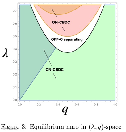 在本文中,通过引入中央银行数字货币来扩展支付工具的集合。作者认为中央银行数字货币是一种电子版的现金。在这种背景下,这意味着CBDC允许卖家进行在线销售而不向银行透露其类型。相应地,卖家现在也可以选择在线-CBDC交易方案(ON-CBDC)。请注意,非在线-CBDC方案与OFF-C方案相同,所以我们不需要单独考虑它。对比发现,CBDC的引入导致了在线销售的增加。由于卖家可以保持匿名,他们可以通过分离式合约获得一些与更有效匹配有关的好处。图3显示了这一点,它在(λ,q)空间中绘制了CBDC下的均衡(覆盖了图2中显示的只有现金和存款的均衡的描述)。
