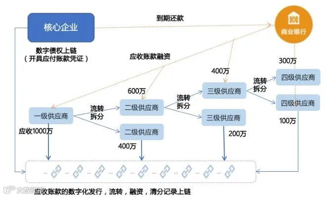 (3)融资申请:在核心企业确认的前提下,已经形成应收账款的1级供应商,可以向金融机构申请融资,或者将已确权的应收账款拆分给2级供应商。