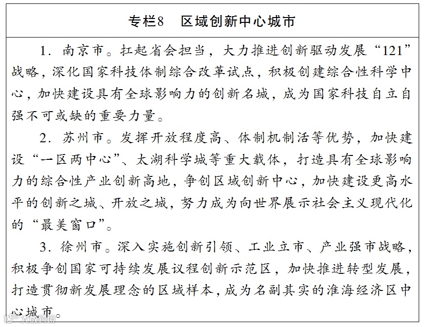 对标国际一流创新城市和地区,发挥地方主体作用,加强省市协同共建,集聚各方科技资源和创新力量,加快建设带动性强的现代化国际化创新型城市。突出优势特色,统筹苏南苏中苏北不同区域,引导11个国家创新型城市立足不同的资源禀赋和基础条件,探索各具特色的创新发展模式、建设路径和动力机制,推动打造若干区域创新示范引领高地。支持淮安、宿迁积极争创国家创新型城市试点,力争实现设区市全覆盖。支持有条件的县(市)积极争创国家创新型县(市)试点,在全省推广常熟、海安县域科技创新体制综合改革试点经验,促进全省县域创新驱动发展和经济转型升级。
