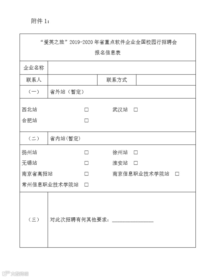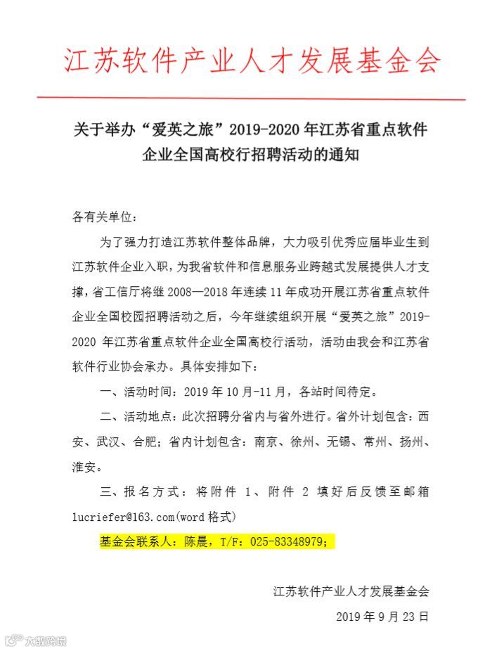 关于举办“爱英之旅”2019-2020年江苏省重点软件企业全国高校行招聘活动的通知