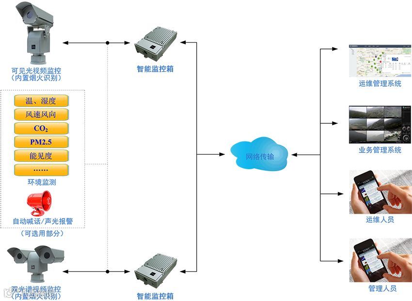 利用物联网技术,通过前端视频监控及环境监测传感器采集数据,通过内置于云台的烟火智能识别器直接进行前端识别,如有疑似或者确认火情,则将相关数据回传到监控中心或移动终端,也可现场自动喊话制止焚烧,实现“及时发现,及时制止,及时惩处”。