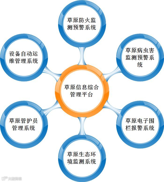 草原物联网监测管理系统主要由“1大管理平台、6大业务系统”组成。