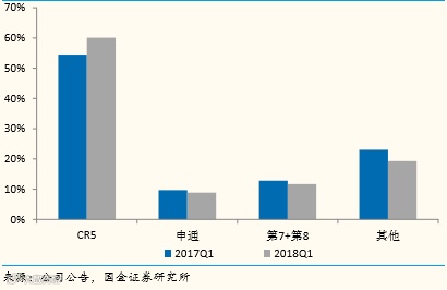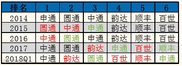 我国快递业2016年开始逐渐形成第一梯队,规模优势体现,使得业务量增速普遍高于行业增速。进入2018 年以来,业务量增速的分化升级,开始在第一梯队出现,龙头效应显现,2018Q1,CR5 提高至60.1%。业务量排名前五的快递公司市占率均有进一步提高,快递业务量有进一步聚集倾向。