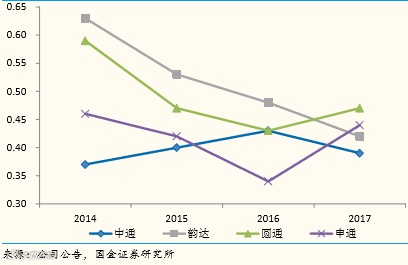而中通和韵达自 2016 年开始对各成本项严格管理,中通引入46套自动化设备,大幅提升中转效能;韵达 通过优化线路,减少转运中心30余个,精简干线运输线路,开创网点自跑等方式,降低单票运输成本,并且进行转运中心设备升级,降低单票中转成本。
