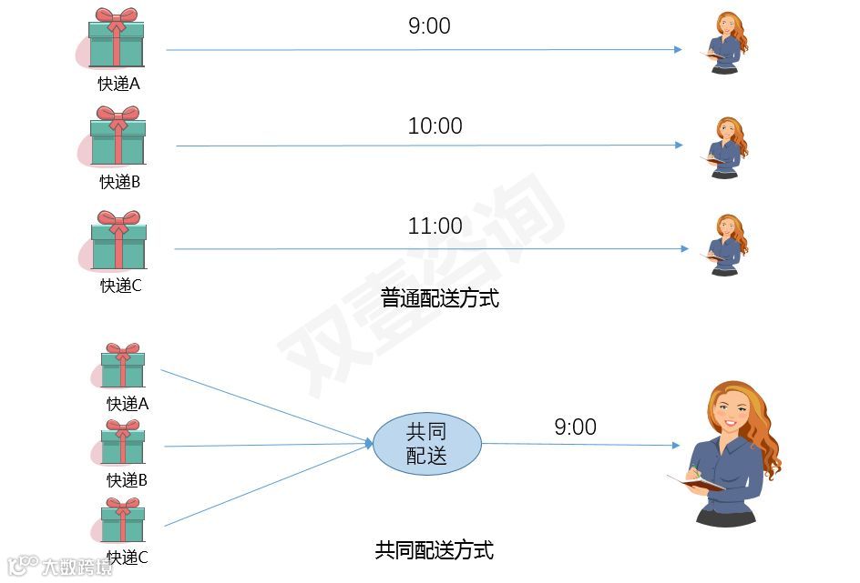 目前市场上关于共同配送尚无统一定义。双壹认为,快递行业共同配送是指为了提高配送效率,将多个快件品牌一起进行分拣、投递、签收的配送方式。在中国派件难的重点地区,共同配送已经逐渐发展起来。