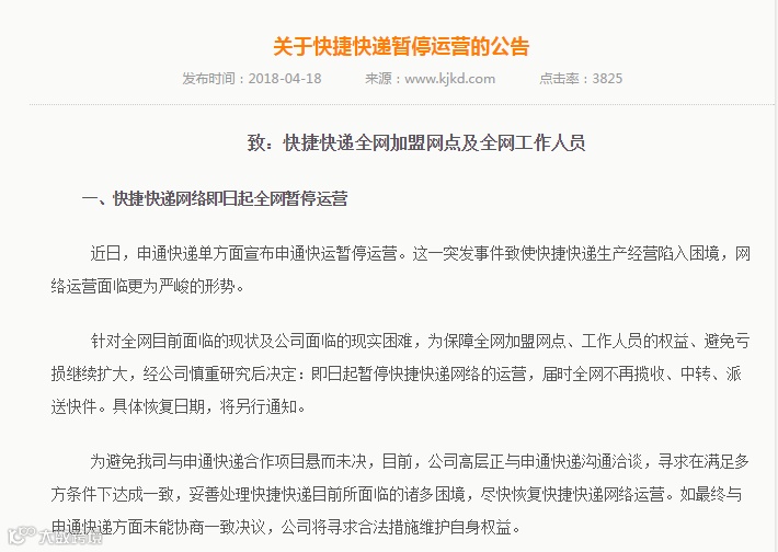 随后4月18日,快捷快递官网发布通知,快递快递自今日起暂停全网运营,进行业务调整,届时快捷快递全网不再揽收、中转、派送快件。此通知更像是抱怨书,直言快捷快递在业务转型过程中面临诸多困难,主要是申通快递股份有限公司不诚信的终止与公司合作经营快运业务,并擅自暂停申通快运的运营,给公司运营造成严重的损害。