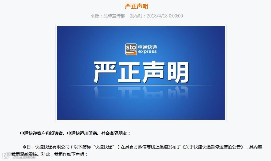 18日申通做出反击,发布严正声明。称快捷快递未按时缴纳出资款,并且快捷快递的股东未就重组方案达成一致,公司的债权人兼持股10%以上的创始人股东吴传龙于2018年4月13日向青浦区人民法院申请公司进行破产程序。截止目前,吴传龙先生仍未履行相关约定。鉴于快捷快递生产经营处于半停滞状态,申通快运不得已于2018年4月17日发布《关于暂缓推进申通快运项目的公告》。