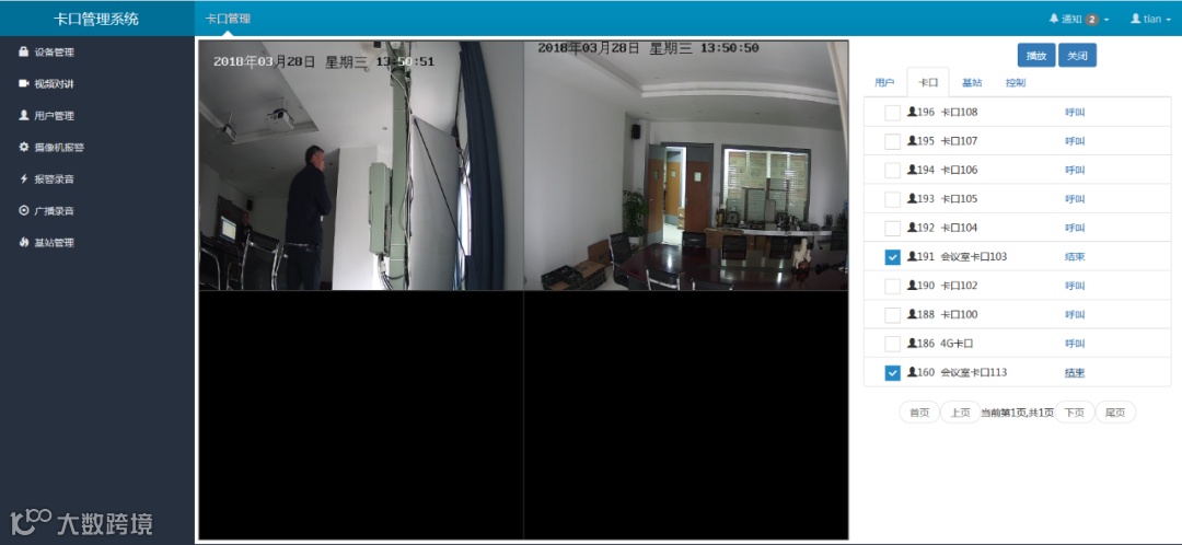 在“视频对讲”界面,提供对所有卡口进行呼叫;选择单个或多个卡口,点击“播放”按钮,即可预览卡口实时视频;点击“呼叫”,即可对该卡口进行讲话。