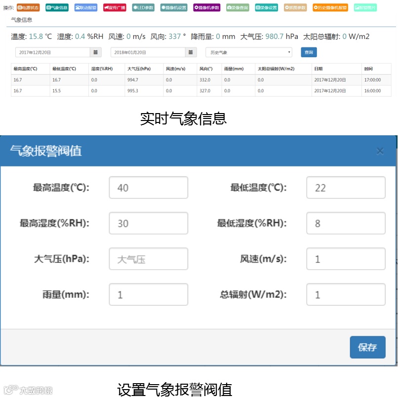 在系统中实时显示自身设备及各接入的监测设备采集的信息,如气象信息,可以查看温度、湿度、大气压、风速、风向、雨量和太阳总辐射信息,并可设置报警阀值,当超出设置范围则发送报警消息;同时支持历史记录查询。