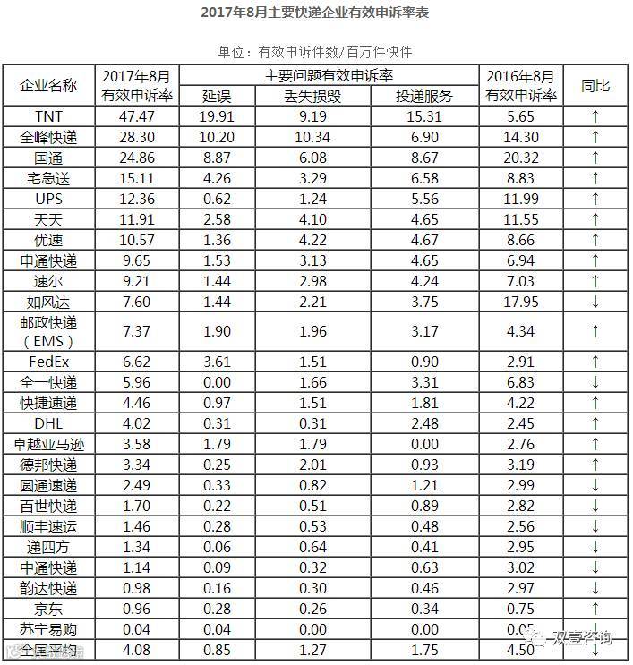 从各家快递企业来看,消费者对43家快递企业进行了有效申诉,全国快递服务有效申诉率为百万分之4.08,环比减少0.51,同比减少0.42,高于全国平均有效申诉率的快递企业有14家。