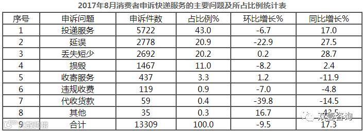 19日,国家邮政局公布了2017年8月份邮政业消费者申诉情况,消费者关于快递服务的有效申诉13309件,环比下降9.5%,同比增长17.3%。