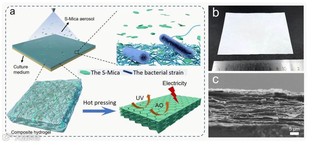图1复合纳米纸的的制备与结构。(a)生物合成复合纳米纸的构造过程示意图;(b)纳米纸的数码照片;(c)纳米纸的仿珍珠母的“砖-泥”结构。