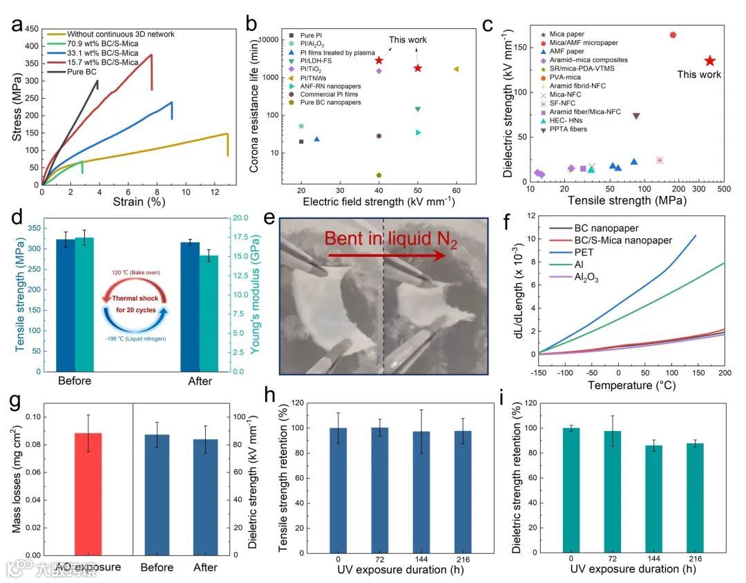 图2.纳米纸的综合性能。(a)纳米纸的力学性能表征;(b-c)纳米纸的综合性能与文献中绝缘材料的对比;(d)纳米纸热振前后的力学性能对比;(e)纳米纸在液氮中弯曲照片;(f)纳米纸的热膨胀系数;(g)纳米纸对原子氧的耐受性表征;(h-i)纳米纸对紫外线的耐受性表征。