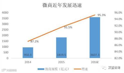 亿欧智库统计显示,微商(朋友圈C2C代理分销交易)规模在2014年仅为950.3亿元,2016年估计达到3607.3亿元(约同年电商规模的7%),连续两年增长速度超过90%。2016年过10亿销售额的微商,超过20家以上,其中棒女郎超过100亿。微信当中,还有大量的个人商品交易,东哥本人也曾经在微信上直接转账向朋友购买过跨境电商、野蘑菇、车厘子等商品服务。而这些交易额,是不会计入到网购统计数据当中,而实际上都会使用物流快递服务。