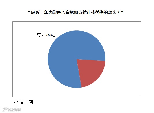 快递业被誉为“经济黑马”,是“大众创业、万众创新”的践行者,成千上万的快递网点都是因为看好美好的发展前景才加入到快递行业中来,从而构成了巨大的快递服务网络。他们怀揣着梦想,把多年的积蓄投资进来,没日没夜地干,然而三天两头的网点倒闭、罢工事件让一个个现有快递创业者信心倍受打击而萌生退意。在双壹最近开展的快递网点生存状况的小调查中,73%的被调查者表示网点经营的压力“非常大”, 78%的被调查者表示最近一年内有转让或关停网点的打算。