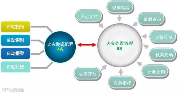 系统全天候24小时自动对前端林区进行扫描,当前端林区出现火情时,系统会自动识别火情并向后端监控中心发送报警信号,同时会将火点位置在地图上精确定位,一旦火灾确定,决策人员可以通过视频追踪、资源查询、火情推演、预案管理等功能进行扑救会商并制定详细的灭火作战方案,然后将灭火作战方案下发至各个执行单位,决策人员还可通过系统对人员、车辆、物资、通讯设备等进行指挥调度达到快速消灭火灾的目的。