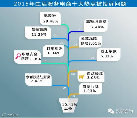 报告显示,2015年中国电子商务投诉与维权公共服务平台共接到的全国网络消费用户涉及电商投诉数量同比2014年增长3.27%,其中以淘宝、天猫、京东、唯品会、苏宁易购、亚马逊中国、乐视、小米、聚美优品、丰趣海淘等为代表的电商平台(品牌)涉及的网购投诉占总投诉的43.74%,位列第一位;以美团、大众点评、百度糯米、携程、去哪儿、饿了么、窝窝团为代表的O2O生活服务电商占总投诉24.05%,排在第二位;在2015年海淘需求爆发式增长的形势下,跨境电商投诉以7.53%位列投诉第三位;而互联网金融领域今年的投诉增长迅猛,同比2014年增长2.81%,排在第四位。
