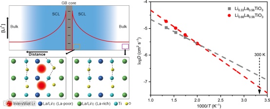 马骋教授团队发挥了球差校正透射电镜具有原子级分辨率的优势,以Li0.33La0.56TiO3这一经典固态电解质的晶界作为研究对象,揭示了空间电荷层对其离子传输的影响。在文献报道中,研究者普遍认为该材料之所以会具有过大的晶界电阻,是因为空间电荷层在晶界附近形成了锂离子浓度极低的区域,从而限制了离子迁移效率。不同于这一认知,马骋教授团队通过球差校正电镜观测发现晶界附近的锂离子浓度反而高于材料中的平均水平,并且精准确定了这些多余锂离子在晶格中的位置。