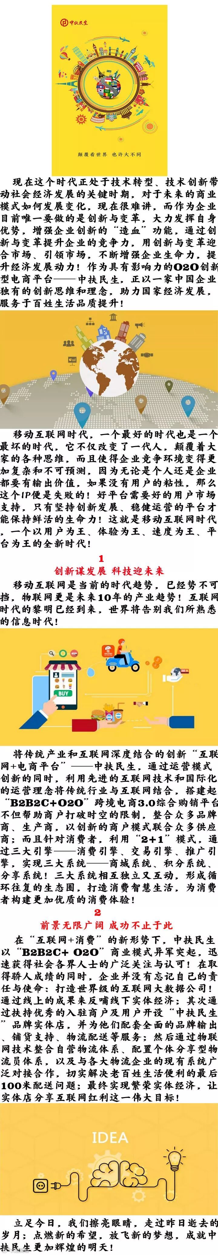 辽宁中扶民生科技有限公司是一家融汇新技术、新零售、新经济为一体的互联网创新型企业,总部坐落在辽宁省沈阳国际软件园,注册资金1亿元。历经三年的市场调研,中扶民生IT团队研发出“中扶民生集成交易系统”!致力于打造通用积分平台,缔造全新消费理念!