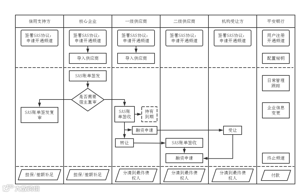 “平安好链”平台是一个以客户为中心,融合支付链功能,为核心企业及其上游供应商提供线上应收账款签发、转让、融资、管理、结算、理财等全流程服务的平台。“平安好链”平台综合运用区块链、云计算等技术,确保了应收账款转让信息的精准溯源及不可篡改。在“平安好链”平台上,核心企业依照平台规则签发一种记录业务贸易合约下交易双方权利义务关系以及账单转让详情电子化单据,即SAS账单。其运营流程如图3所示,供应链核心企业可以基于合同贸易背景对到期的付款账单进行确认并转让,各级供应商在收到账单后可以继续转让给下级用以抵消双方之间债权债务,或是直接转让给平安银行获取融资。“平安好链”平台参与主体还包括机构受让方和信用支持方,其中,机构受让方包括银行、保理商与平台企业,负责受让基于真实贸易背景签发的SAS账单;信用支持方一般为资信良好的上级企业及与核心企业相关联的其他法人机构。截至2022年3月末,“平安好链”平台累计交易量1123亿元,融资额520亿元,供应链票据交易量8.2亿,累计服务核心企业357户,供应商3324户。