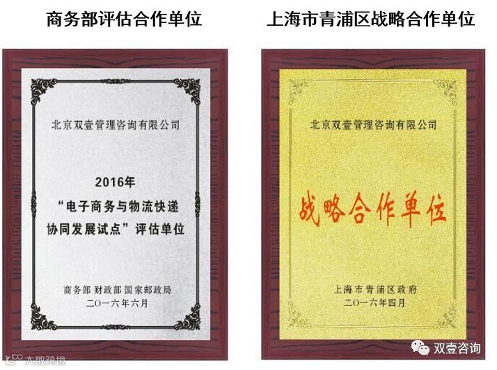 双壹也是政府的政府的智囊机构,是商务部、财政部、国家邮政局“电商与物流快递协同发展试点城市”(一期、二期)的评估机构,是上海市青浦区政府的战略合作单位,是上海市邮政管理局的常年合作单位。