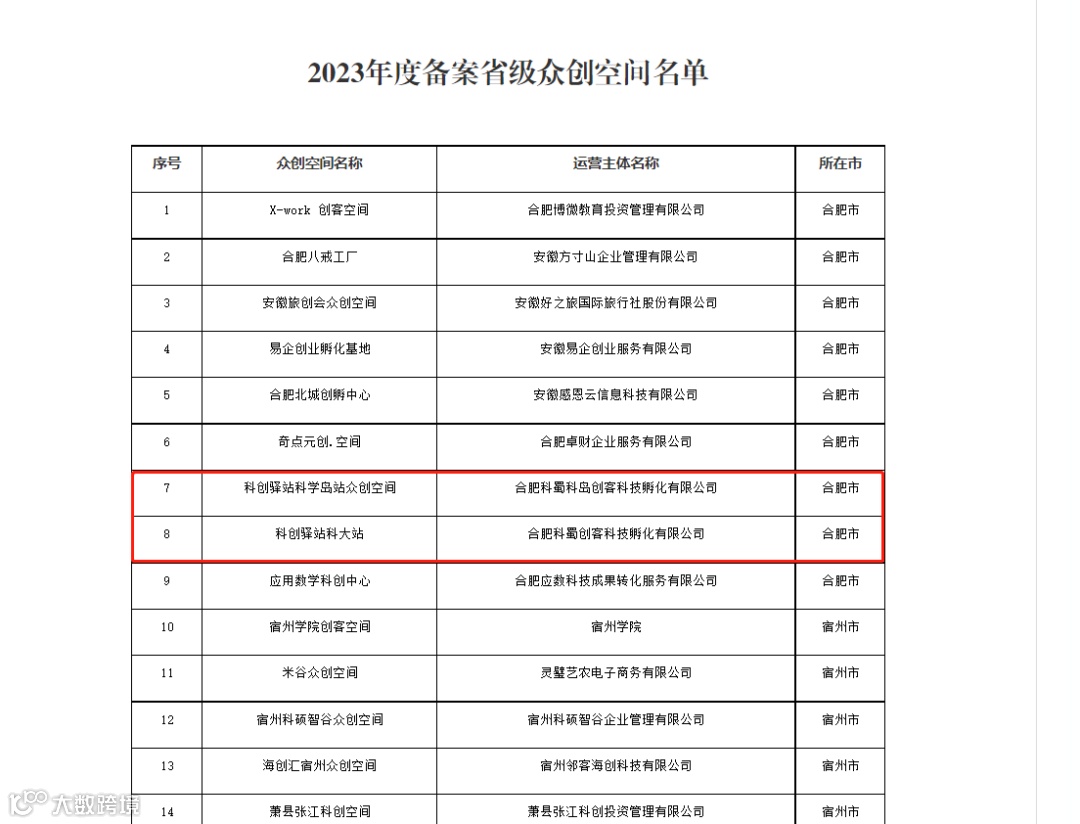 7月24日,安徽省科技厅公布了2023年度省级众创空间名单,其中科创驿站科学岛站和科创驿站科大站成功入选,成为蜀山区孵化载体建设的新亮点。