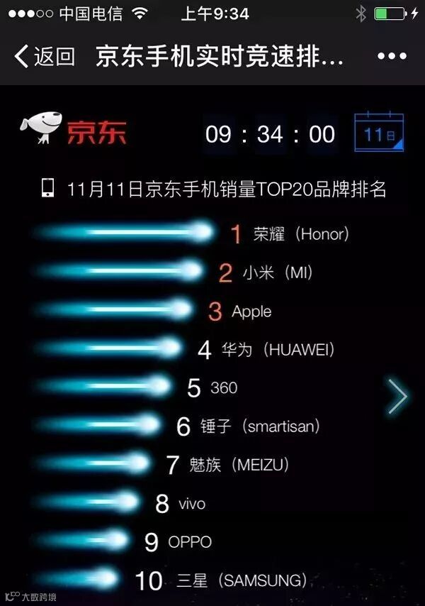 双十一开场之后1小时35分,小米公司官方微博发文称,天猫旗舰店支付金额破10亿。当天,荣耀手机官方再次发布了最新的战报称,华为携手荣耀在天猫平台耗时95分钟手机销售额便突破10亿元。此前,荣耀天猫官方旗舰店耗时1小时14分销售额正式突破6亿。此外,在国产手机品牌中,包括vivo、魅族等品牌尚未发布销售数据。