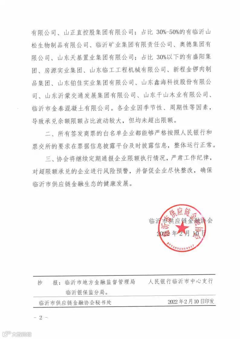 2022年1月临沂市供应链金融白名单企业商业承兑汇票限额执行情况的通报