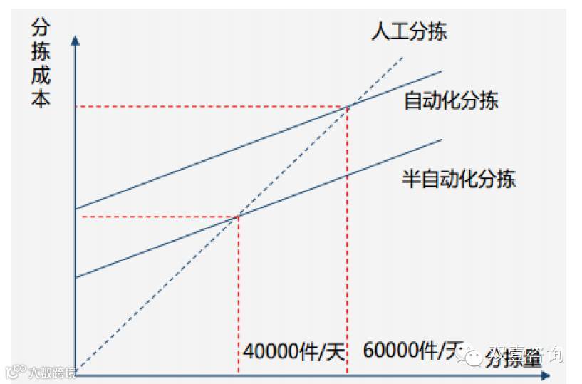 除了“最后一公里”以外,快递中端的包裹分拣也是劳动力非常密集的业务。广发机械组在报告《智能分拣装备:溪云初起,山雨欲来》中估算,对于快递企业一级转运中心来说,每天40000件与60000件分别是半自动化分拣与自动化分拣替代人工分拣的成本临界线。