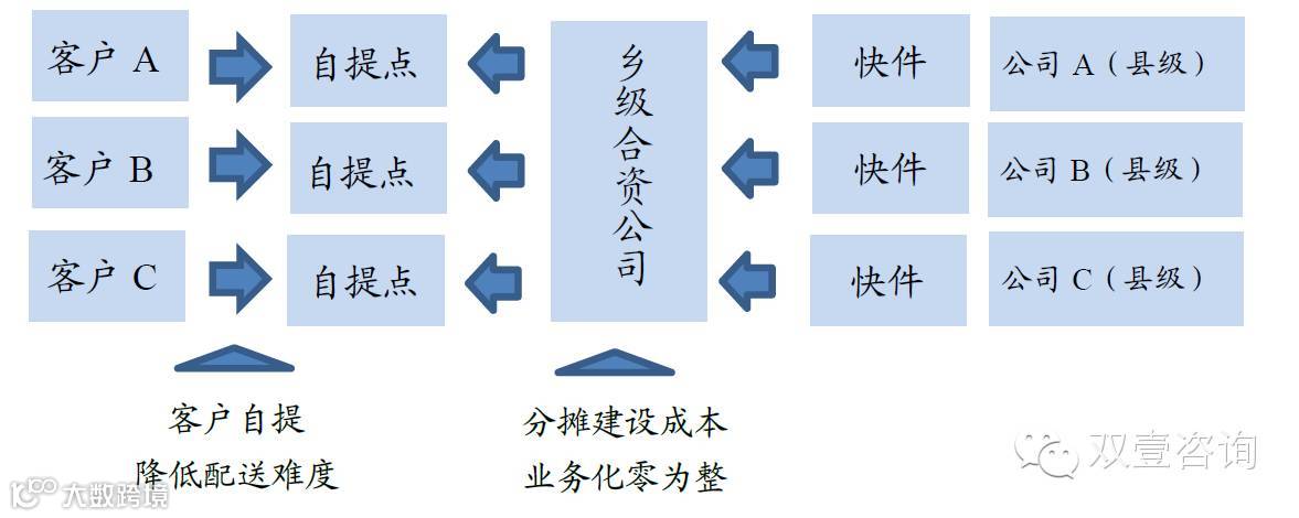 现有“快递下乡”一般以两种方式缩减成本,一是各家民营企业通过抱团取暖成立合资公司进行运营,大家分摊成本,合作创收;二是通过与当地零售网络合作,开设自提点,将“最后一公里”配送进行简化以节约成本。