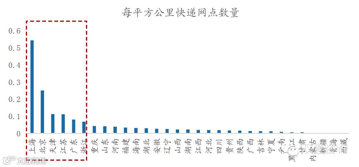对于低人口密度的广大乡镇地区,快递发件量少且往返不均容易造成网点的亏损,导致行业发展缓慢。以单个网点的年均业务量进行对比,可以发现浙江、上海等省市单个网点年均派件20万件以上,而西部的青海、甘肃、贵州等地不足2万件,相差10倍以上。