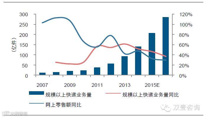 近年来,互联网的普及促进了电子商务的蓬勃发展,其中,2005 年-2014 年间,中国网上零售额的复合增长率达64.7%,预计到2015 年底,网络零售额将达到3.71 万亿,其占全国消费品零售总额比重将从2005 年的0.3%增长至12.3%。网络零售的井喷式发展产生了巨大的包裹运输需求(也就是我们所谓的“电商件”)。电商件的发展拉动我国快递行业的爆发式增长,2011 年以来,我国规模以上快递收入同比增幅达到37%,规模以上快递业务量保持同比50%以上增幅,2015 年全年快递量已经超过200 亿件,达到2011 年的5.6 倍。