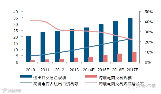 图 5:2010-2017 年中国进出口贸易及跨境电商交易规模