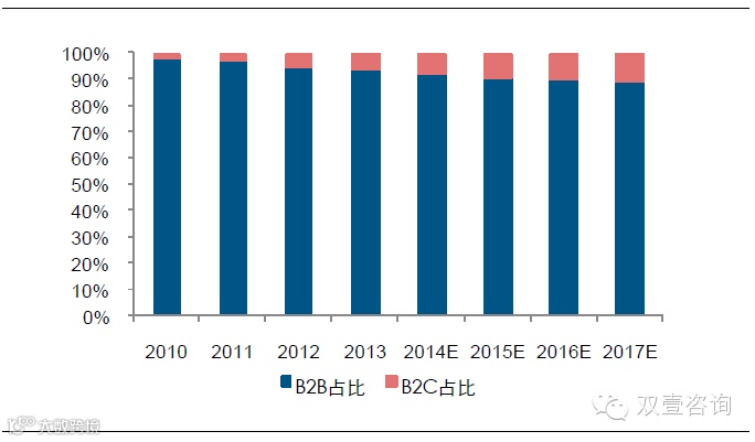 图 6:2010-2017 年中国跨境电商交易规模B2B 与B2C 结构