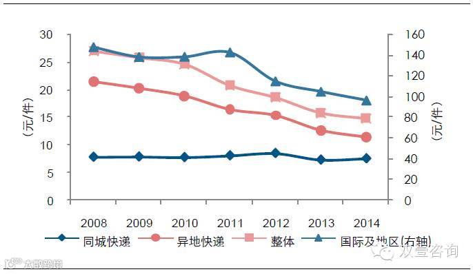 民营企业齐头并进,竞争激烈。通达系凭借“加盟制”迅速在全国铺设网点,并形成规模效应,在2014 年前5 大快递企业中占据4 席。尽管快递行业CR8 一直保持在80%左右,但是CR4 却从09 年的77%下降至14 年的50%,行业龙头竞争激烈,二、三梯队后劲十足。激烈的内部竞争加之受上游电商的强势压价,行业利润空间遭受挤压。14年,异地快递平均价格较08 年下降一半以上,仅为同城快递价格的1.5 倍。快递企业每年利润持续下滑,已经由2003 年的30%下降到2013 年5%左右。