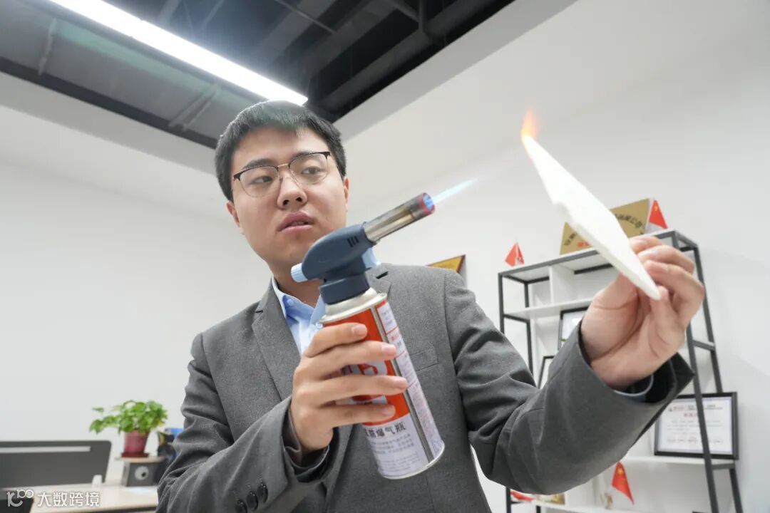 张旭晨向记者展示公司研发的防火材料。全媒体记者 赵瑞瑞 摄
