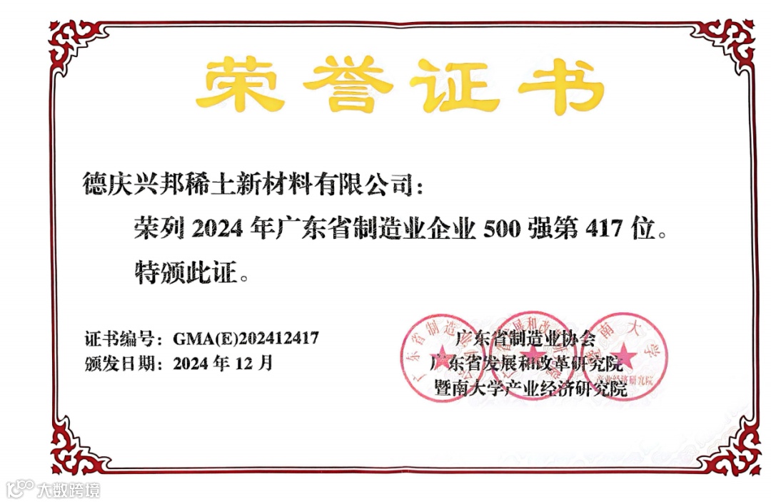 近日,2024年广东省制造业500强企业峰会在广州召开。广晟有色所属兴邦公司连续6年荣列“2024年广东制造业500强”。