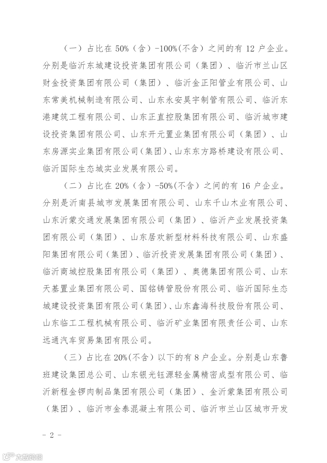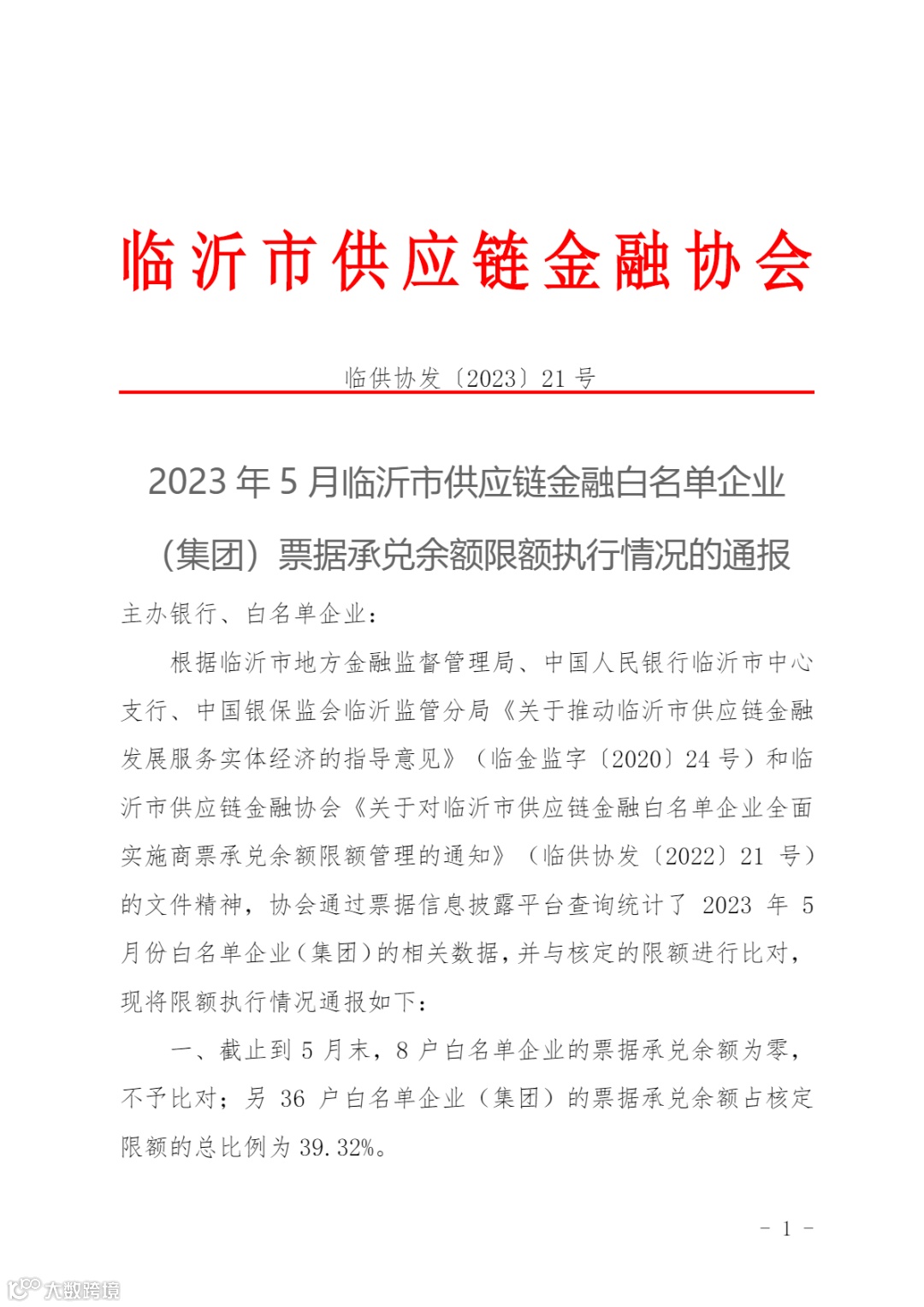 2023年5月临沂市供应链金融白名单企业(集团)票据承兑余额限额执行情况的通报