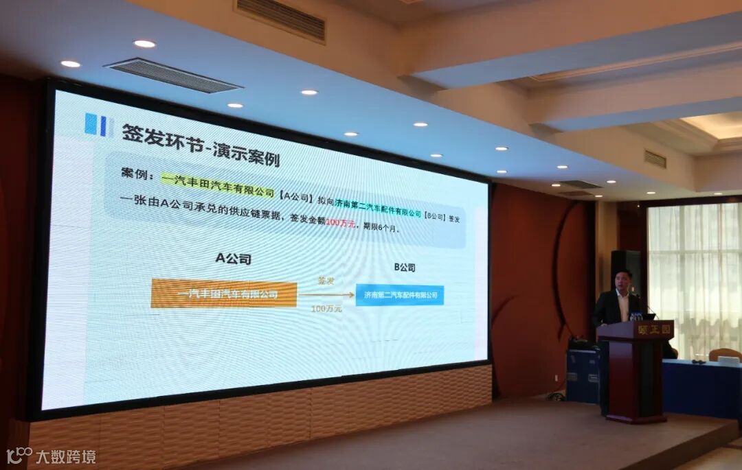 临沂商城供应链票据服务平台的朱世聪介绍了平台操作要点。从企业初次登录平台注册登记,到供应链商票的签发、承兑、背书、贴现、到期付款等全流程操作都进行了现场模拟演示。