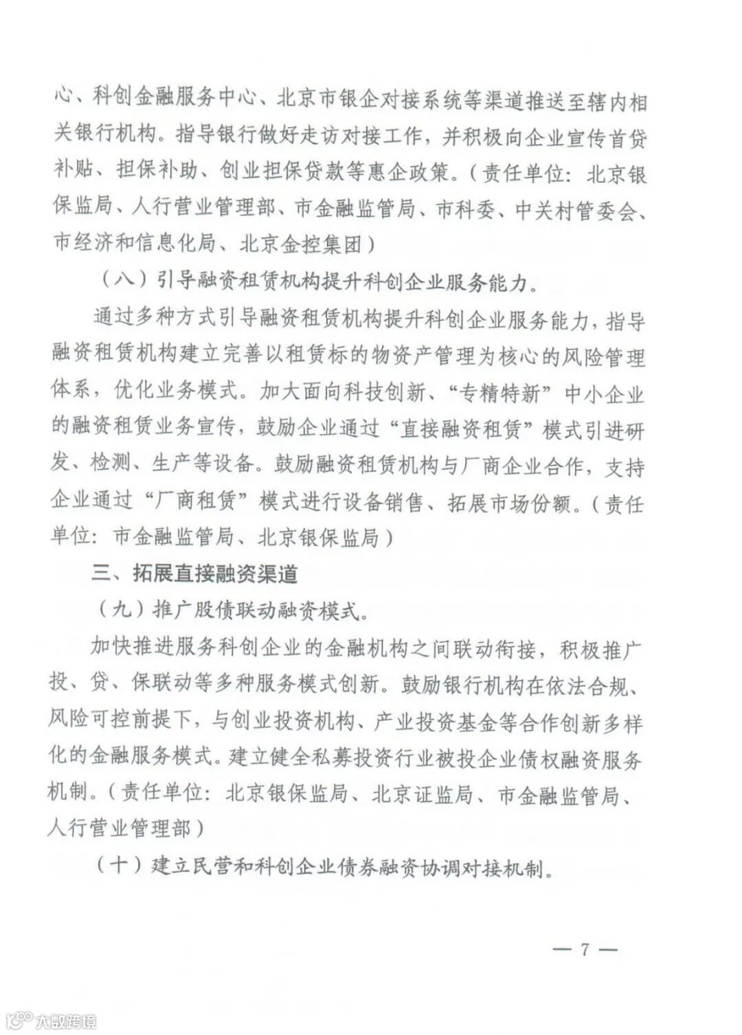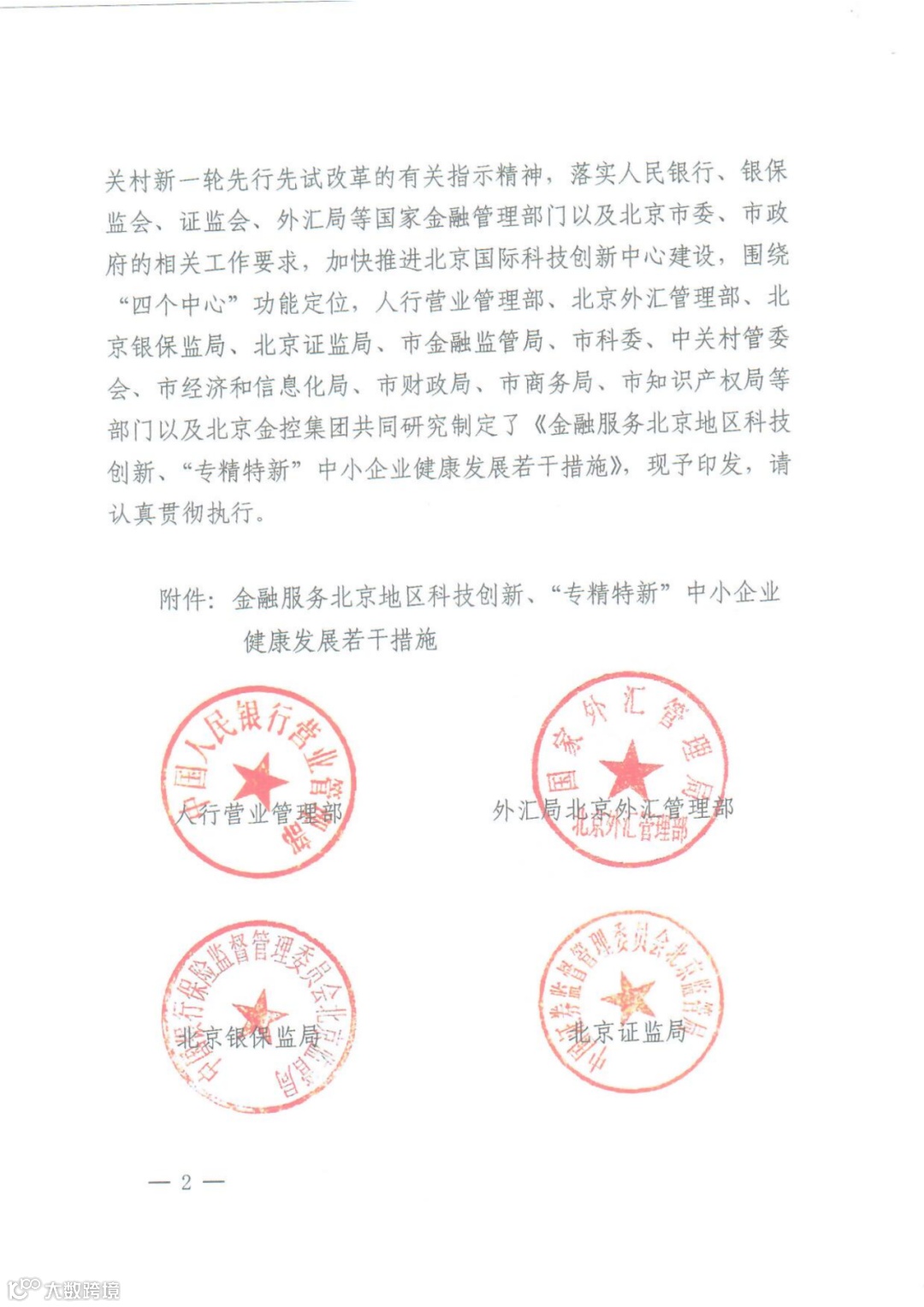 近日,人行营业管理部、北京外汇管理部、北京银保监局、北京证监局、北京市金融监管局、北京市科委、中关村管委会、北京市经济和信息化局、北京市财政局、北京市商务局、北京市知识产权局等多部门联合出台《金融服务北京地区科技创新、“专精特新”中小企业健康发展若干措施》(以下简称“若干措施”)。从建立完善会商机制、加强专项信贷支持、拓展直接融资渠道、提升跨境业务便利4大方面,提出15条具体措施。