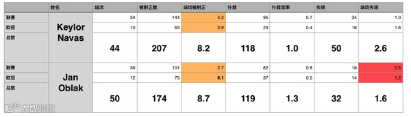 联赛表现出众的奥巴拉克在欧冠中似乎并未展现出同样出色的水准,场均失球竟然翻了一倍还多,在比赛数仅有近四分之一的情况下失球数几乎一样,这倒是很让人吃惊。